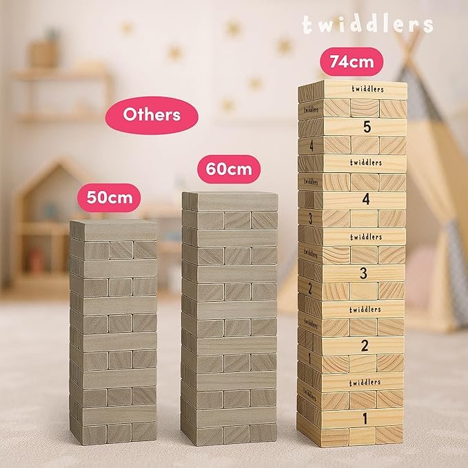 There are many stacking games out there, but not all of them are made with good materials. Some are rough, lightweight, or can break easily. THE TWIDDLERS Tumble Tower is different. These blocks are made from real pine wood that feels smooth and sturdy. They do not bend, splinter, or lose their shape.