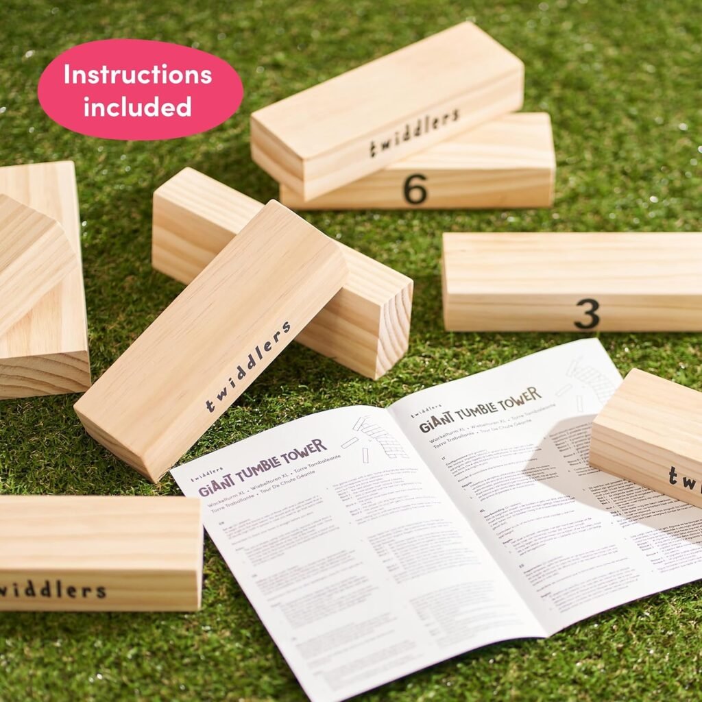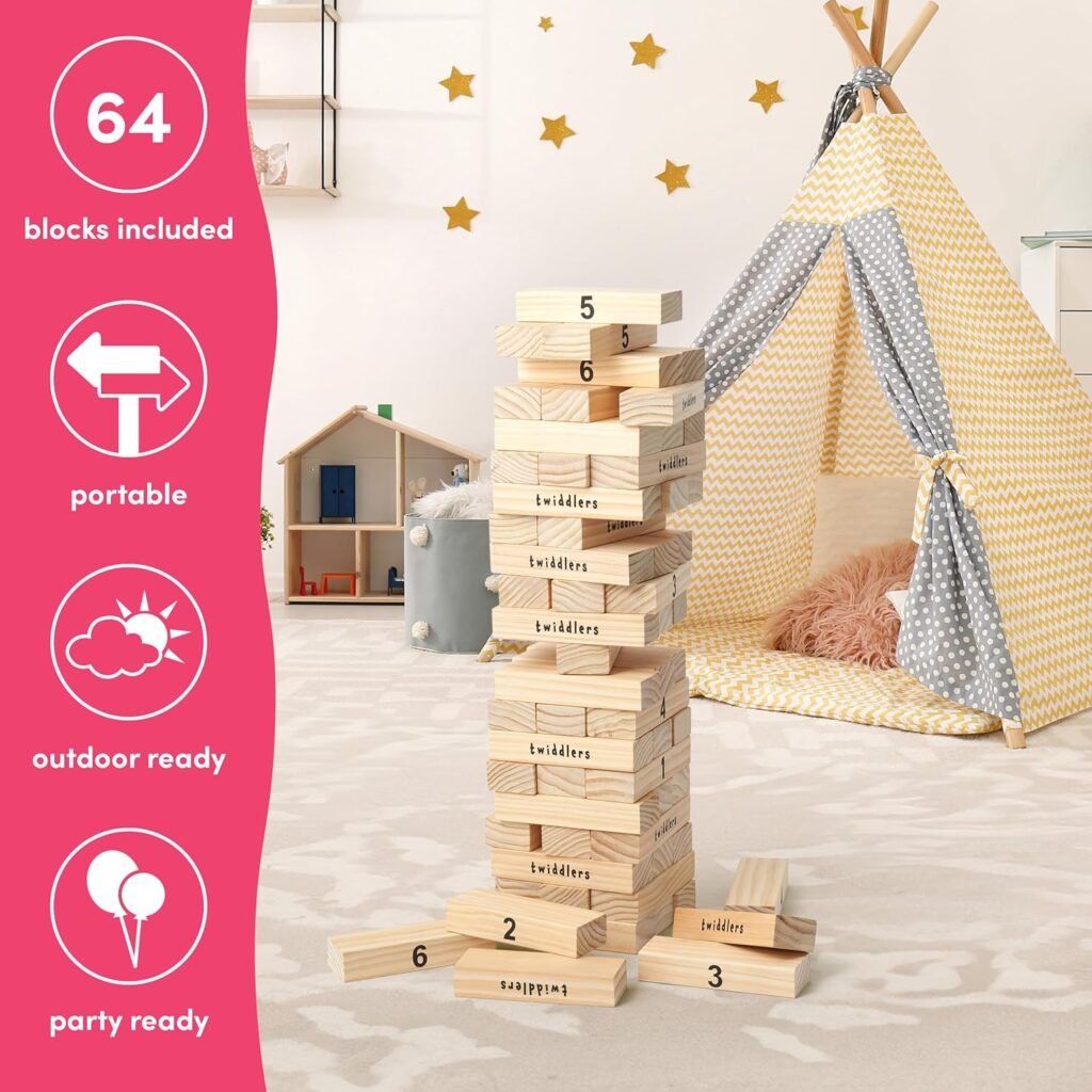 THE TWIDDLERS Large Tumble Tower is a fun stacking game made from large wooden blocks. It is designed for kids who are three years old and up, but it is not just for children. Teens, parents, and even grandparents love to play it too. The game comes with 64 smooth wooden blocks that are safe to touch and easy to hold. These blocks are made from strong pine wood, and each one is sanded by hand, so there are no rough edges.